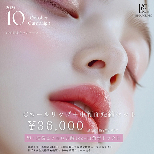 人気のCカールリップと中顔面短縮施術を組み合わせた特別セット。立体感と若々しさを同時に引き出し、華やかなバランスのあるお顔立ちに導きます。
